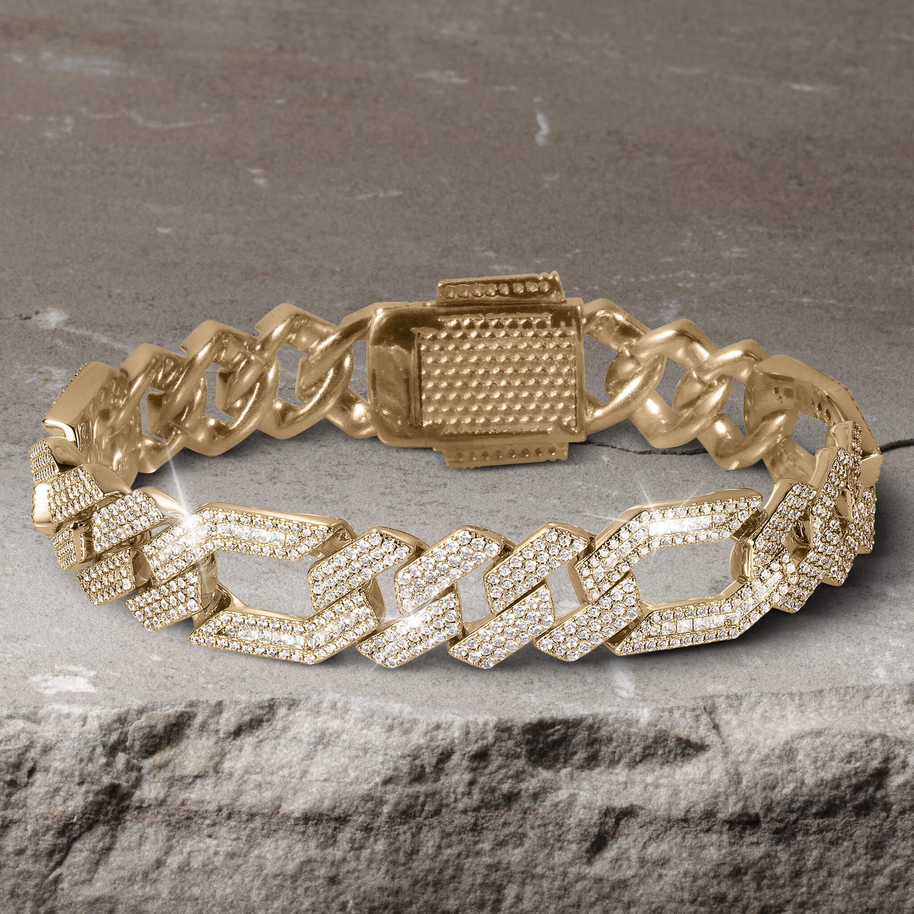 A remarkable bracelet that is a testament to refined style and timeless elegance. The fancy Figaro link is finished in yellow gold and adds a touch of warmth and richness, enhancing the bracelet’s inherent allure. Each link showcases a stunning arrangement of meticulously set ice white Diamondeau®, flawless simulated diamond. Their impeccable clarity and brilliance emulate the allure of genuine diamonds. A versatile accessory that effortlessly complements both casual and formal attire