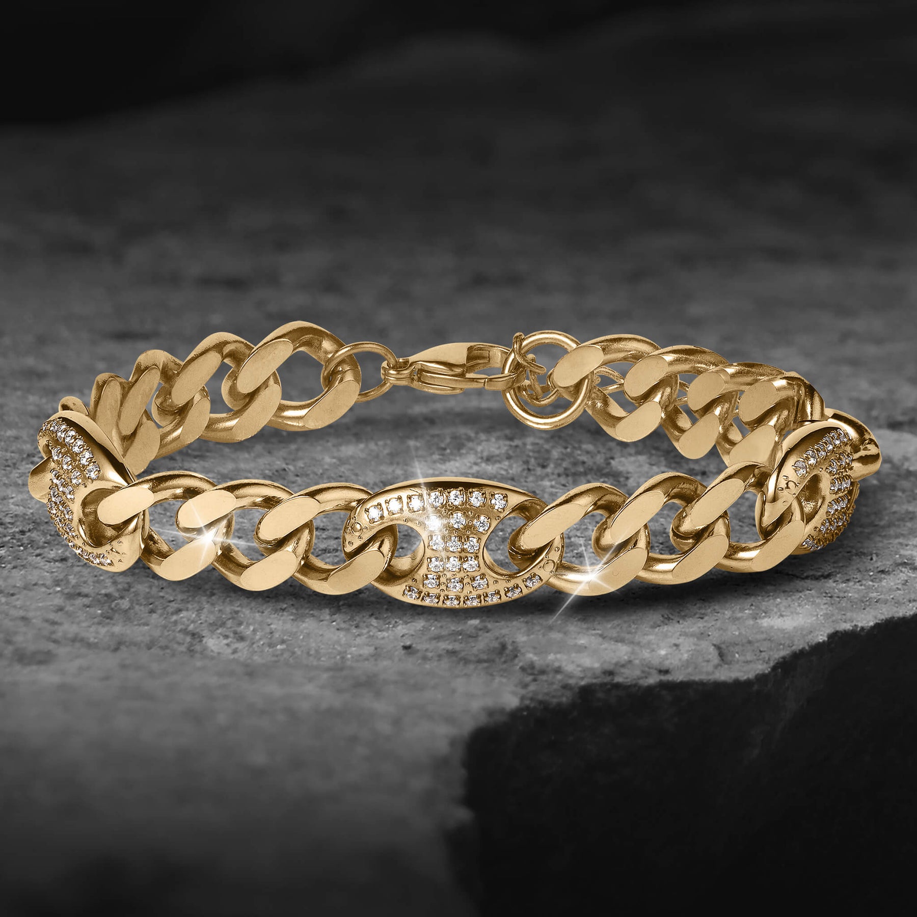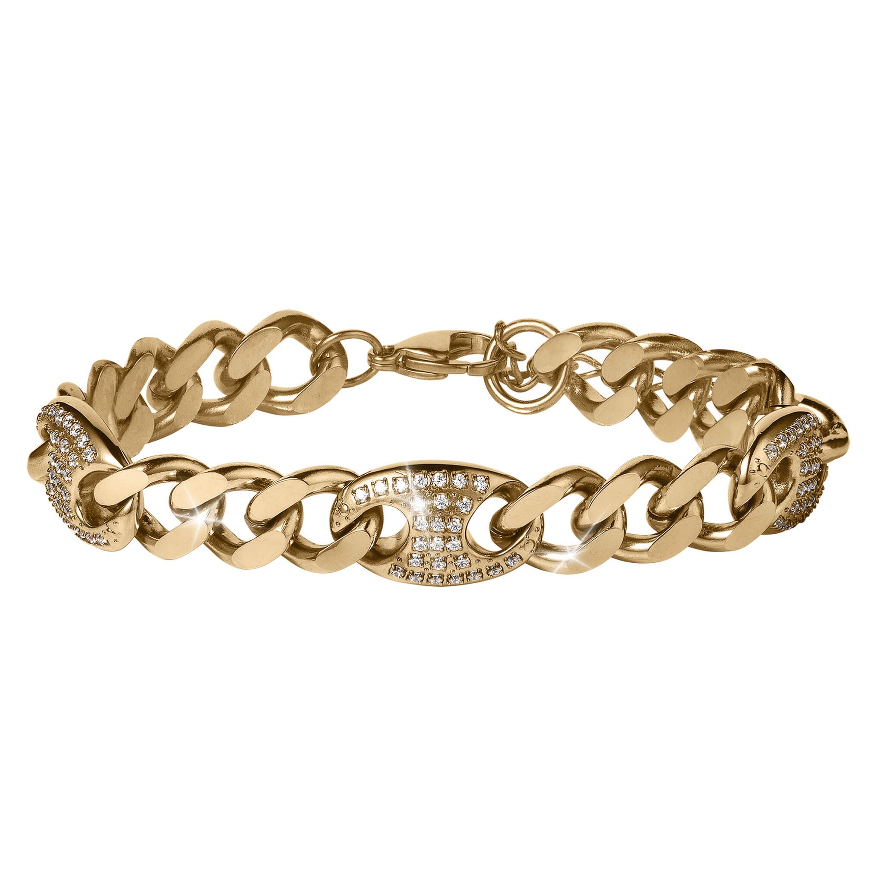 This bracelet is a classic that will never go out of style. Finely crafted from premium grade stainless steel with a luxurious gold finish. This bracelet features timeless curb links. What sets this apart are the oval stations encrusted with sparkling ice white Diamondeau®, flawless simulated diamond. The result is stunning jewelry that is both bold and sophisticated.