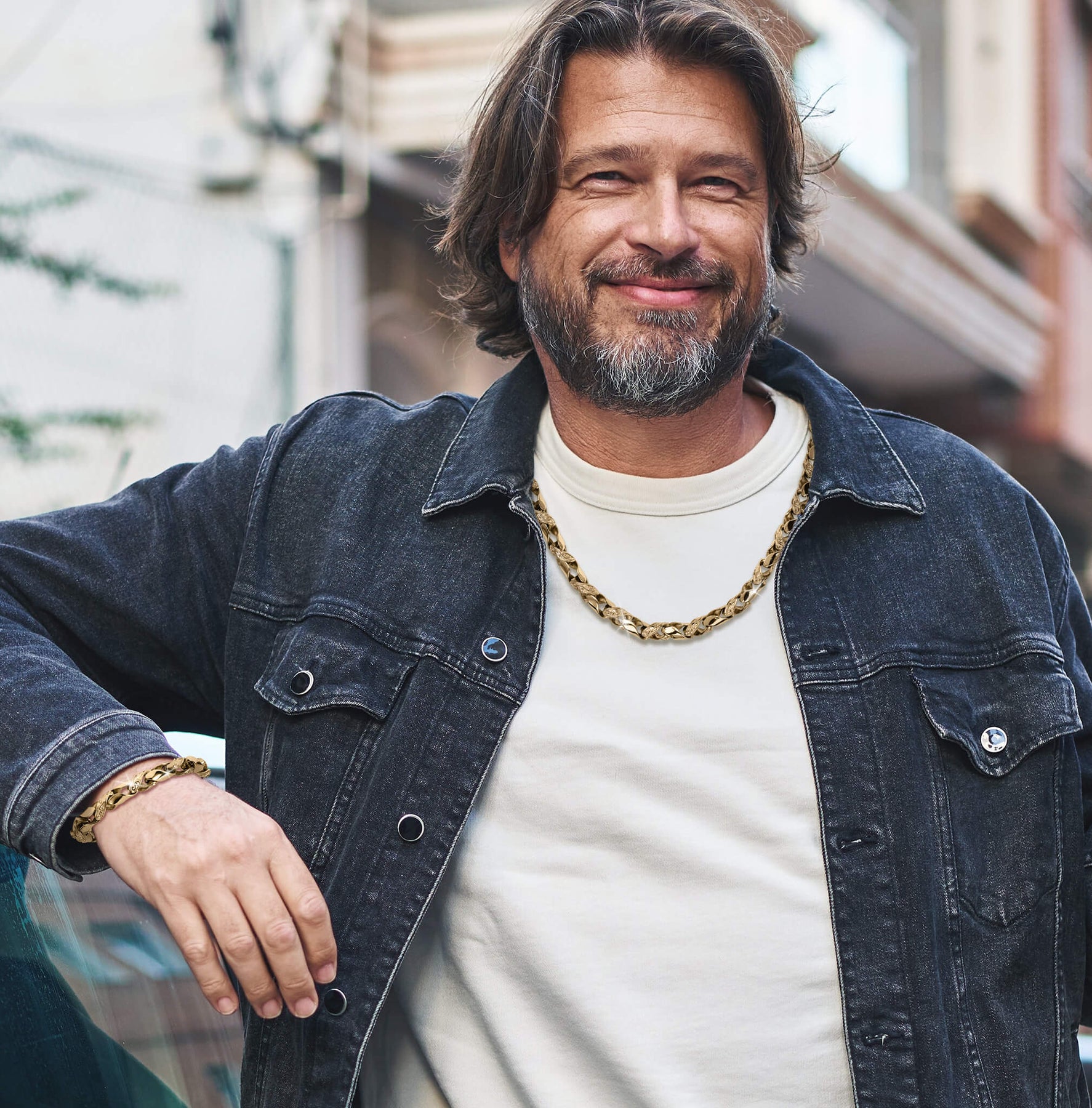 A bold statement bracelet, designed to elevate your style. Premium grade stainless steel finished in yellow gold. The unique links have a standout feature, an intricate scroll detail delicately twisted throughout the links, adding a touch of artistry and intrigue to your ensemble. Both a subtle touch of refinement and a symbol of strength, style and individuality.