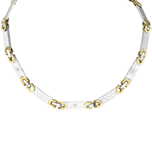 Links of premium grade 316L solid stainless steel are etched with a classical and ancient meander pattern that are held in place by curved links plated in 18k yellow gold. 3 of the links have been expertly set with panels of our flawless Diamondeau® - flawless simulated diamonds. This modern and sporty necklace is the perfect gift for any design conscious man that appreciates luxury.