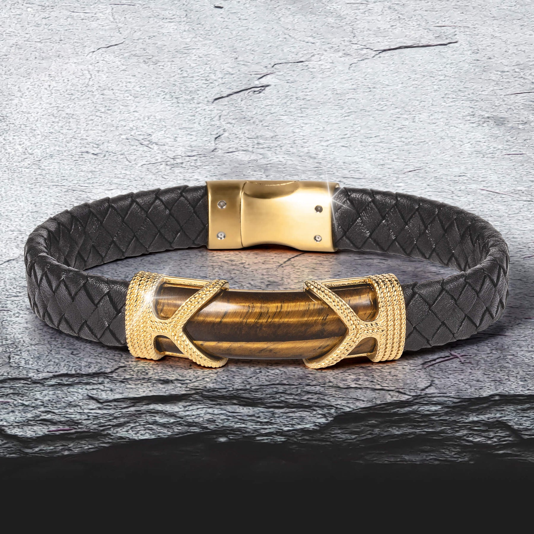 Unleash your inner strength with this striking men’s bracelet, the power of nature meets refined design. A meticulously woven black leather band forms the foundation of this bold piece, offering both flexibility and durability for everyday wear. A captivating Tiger’s Eye stone, renowned for its protection and grounding properties, is held in an embrace of gold plated stainless steel. Make a compelling statement.