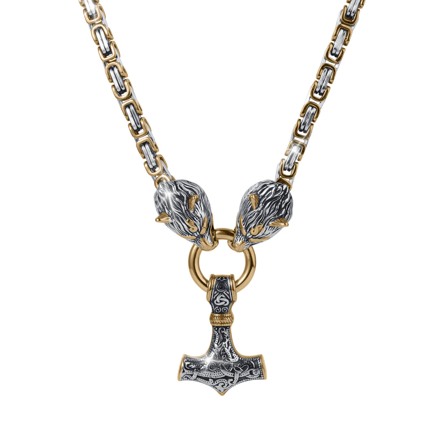 In Mythology, Fenrir is depicted as literally a giant Wolf. Here we bring you two intricately detailed giant wolves guarding Thor’s hammer amulet. This chain is expertly crafted from stainless steel in a two tone finish with the classic Byzantine links. This stand out design has been inspired by Norse mythology and is a must for your jewelry collection.