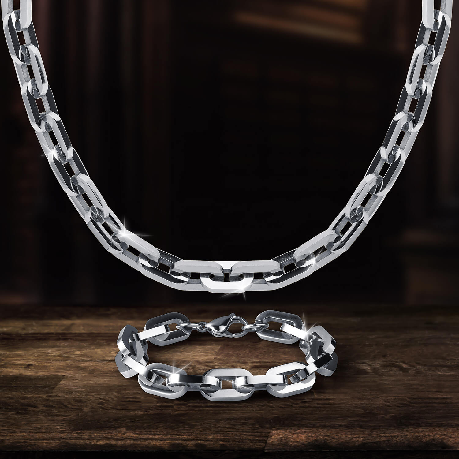 Sophisticated and gentlemanly, this premium grade stainless steel set is a great way to accessorize any outfit. It features a paperchain chunky link, which is stylish and classic. A 24" necklace is paired with an 8.5" bracelet adding to the overall design. Enjoy this set for years to come with its high-quality stainless steel build and luxurious polished finish.