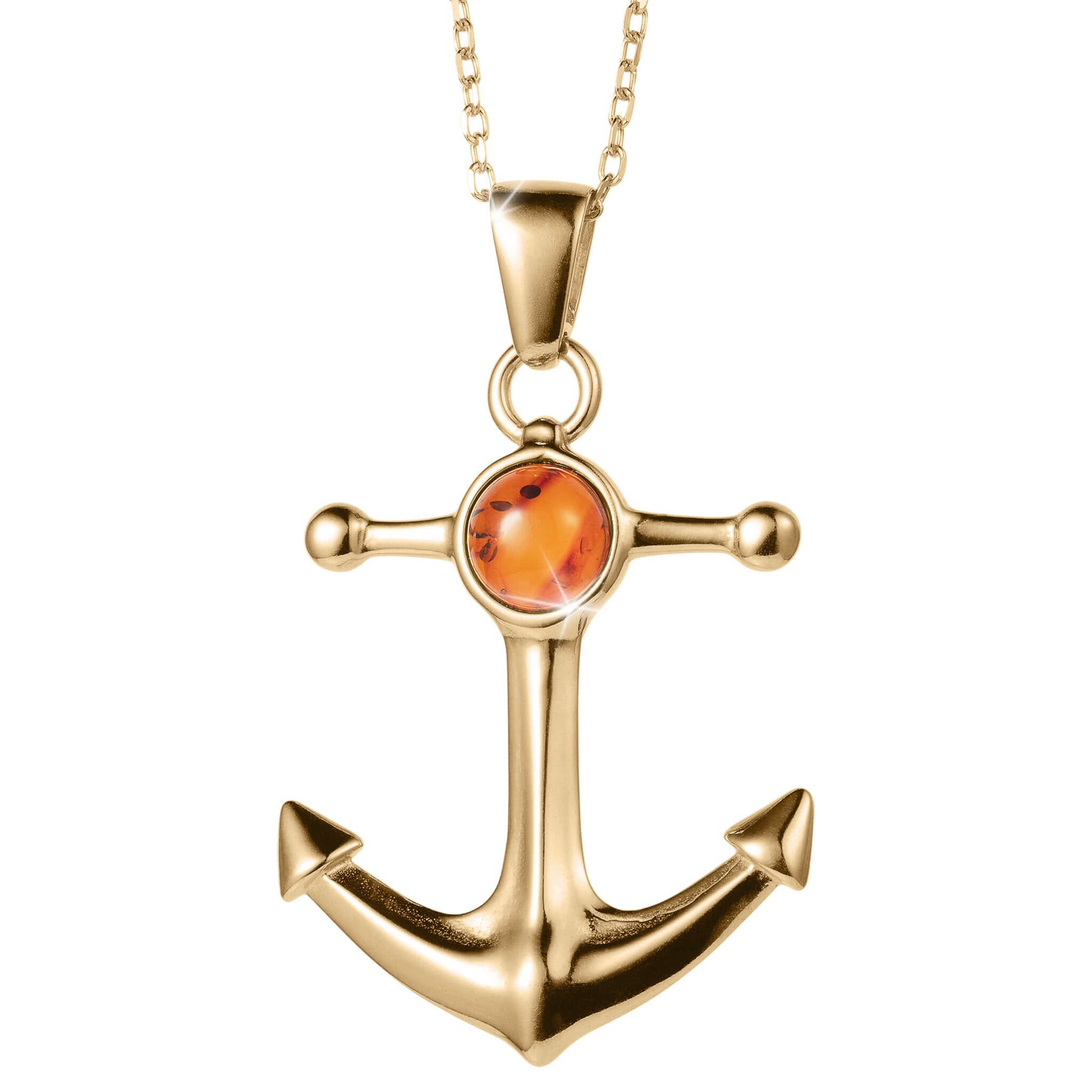 A striking anchor pendant, an emblem of strength and stability. Exquisitely crafted from sterling silver, finished in 18ct yellow gold. A true masterpiece that blends rugged masculinity with refined elegance. At the heart of the pendant lies a solitaire Baltic Amber stone, a jewel cherished for its golden glow and unique markings, reminiscent of ancient forests frozen in time. The Amber’s captivating allure is perfectly complemented by the anchor’s symbolism, representing steadfastness, security, and the ability to weather life’s storms with unwavering resolve. A statement piece that leaves a lasting impression wherever it goes.