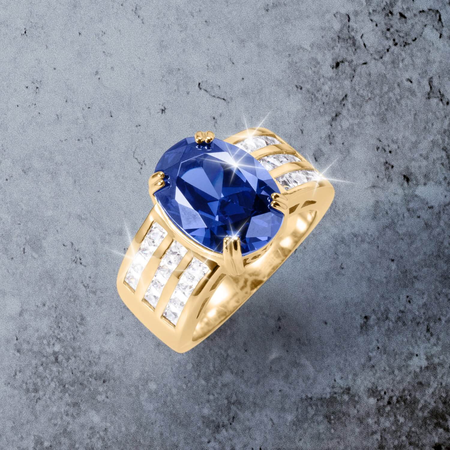 A bold and masculine look, this eye-catching fashion ring is just his style. This distinguished design features a striking 5.05 carat blue Diamondeau®, flawless simulated diamond. Shimmering brilliant white gems adorn the shoulders of the shank completing this design. Beautifully crafted from sterling silver, plated in yellow gold. A style he is sure to wear often.