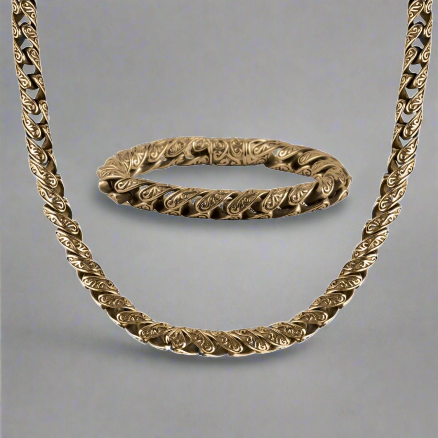 We bring you a bracelet and necklace collection that is to compliment and not to overwhelm. Perfect pieces to be worn every day, from the office to the gym. Crafted from stainless steel, plated in 18k gold with textured barrel links for all round real character. Sometimes a classic piece is needed without the jewels; make a statement without the rows and rows of jewels.