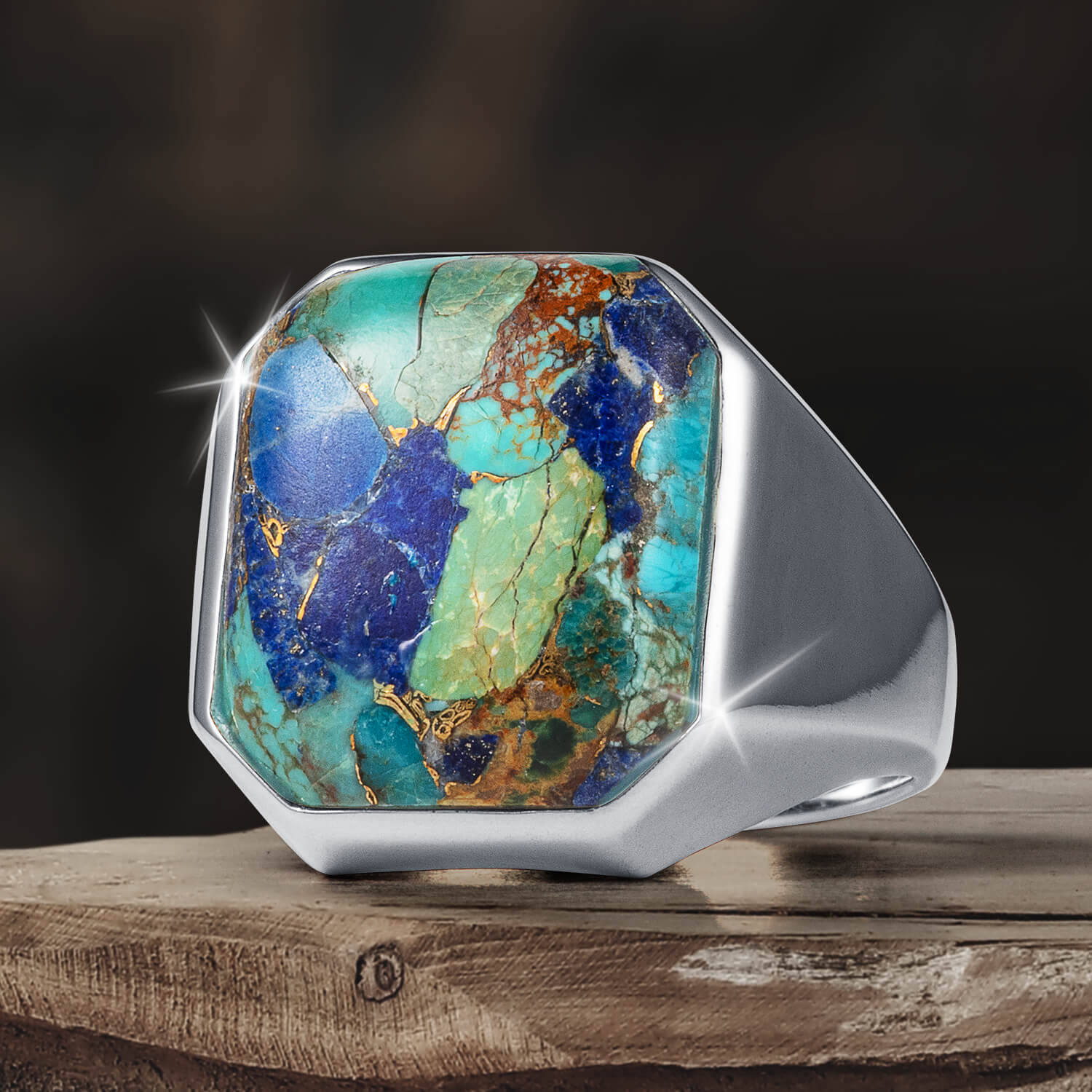 A striking collection that will complement your look. A sterling silver ring mount with an ornate comfort fit back has been set with a stunning, eye catching Lapis and Turquoise stone placed in the center that exemplifies luxury, pair with the matching pendant. Skilful craftsmanship and design have taken this to new heights. Note : Due To Unique & Natural Occurrence Of Gemstones, Appearance May Vary Slightly