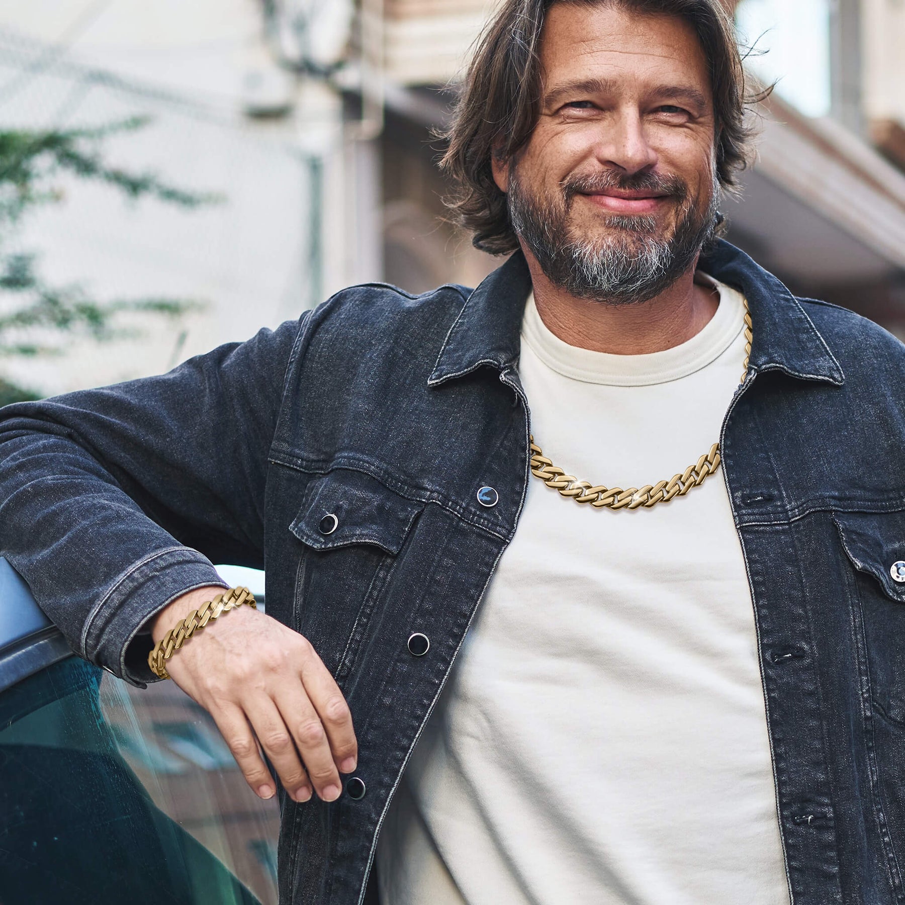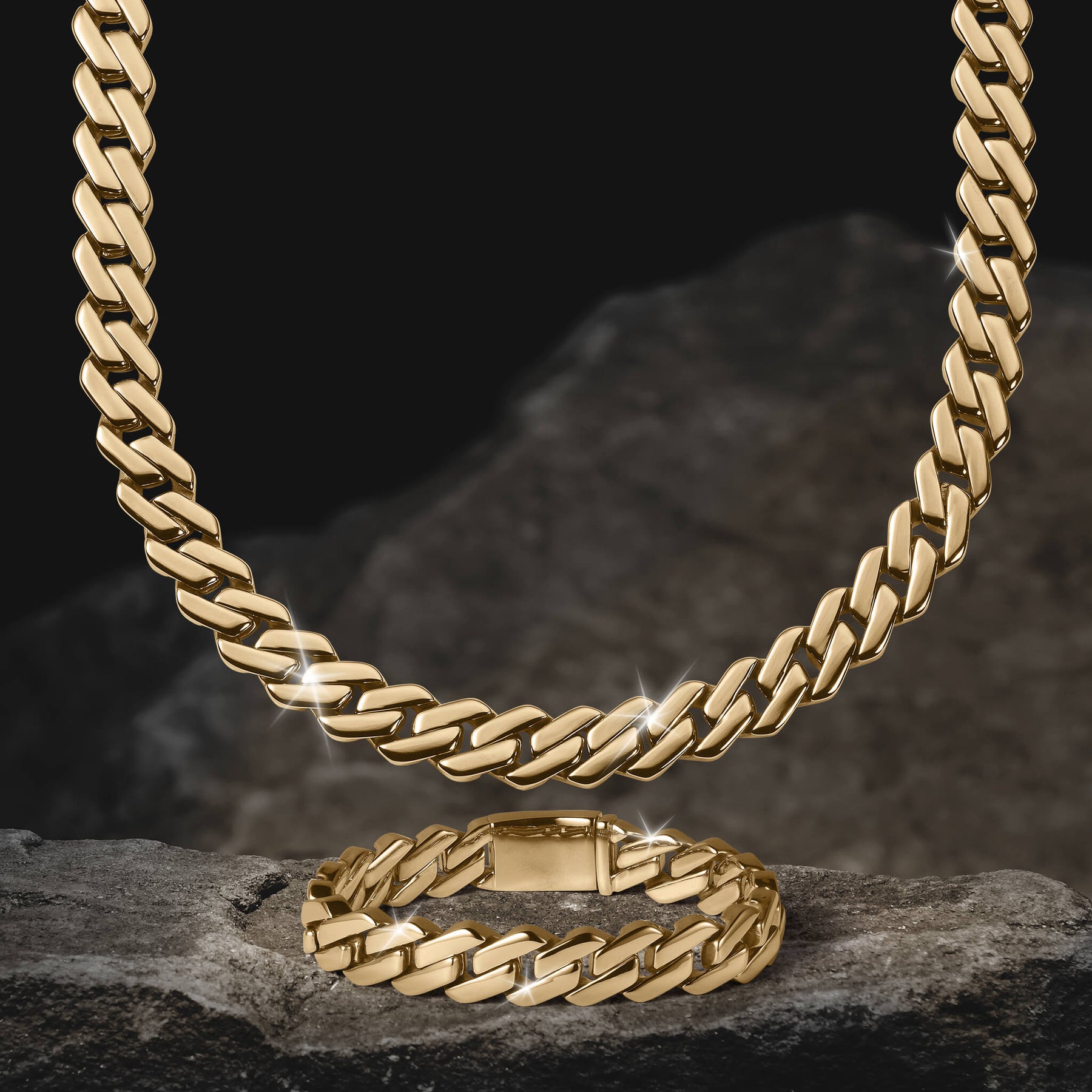 Make a statement that’s as bold as it is refined. Crafted from high quality stainless steel finished in opulent yellow gold. This necklace and bracelet set unite to create a harmonious ensemble that effortlessly captures attention. A contemporary reinterpretation of the classic curb chain, featuring square links that speak volumes in terms of style and individuality. Elevating your everyday attire, this set will be your steadfast companion.