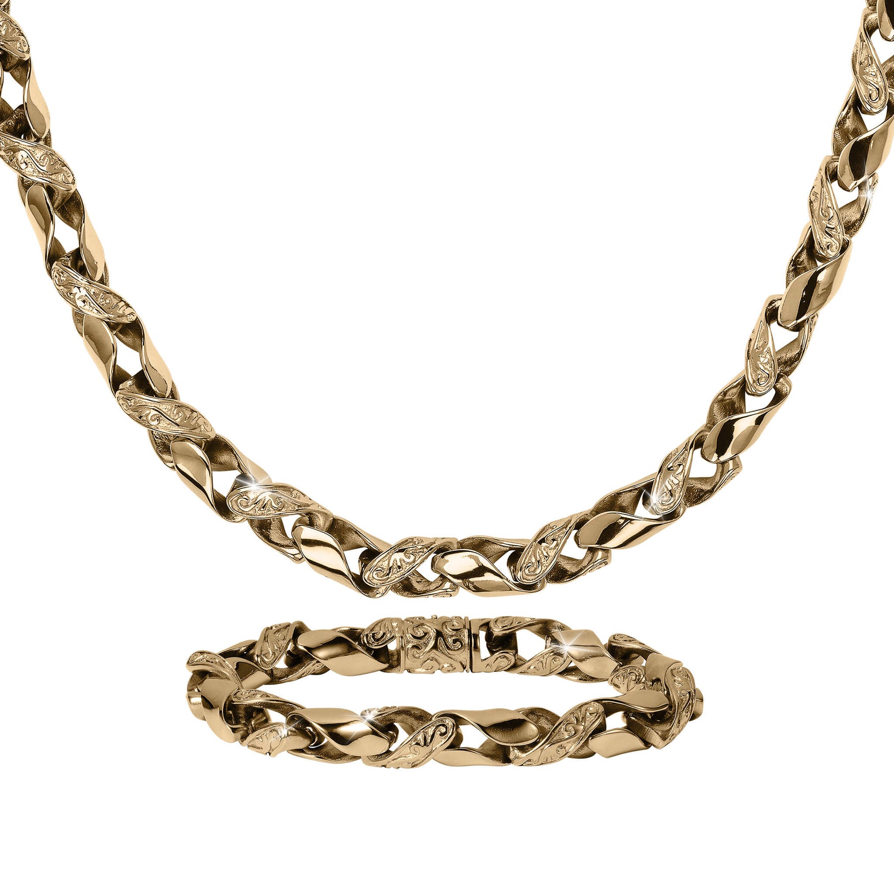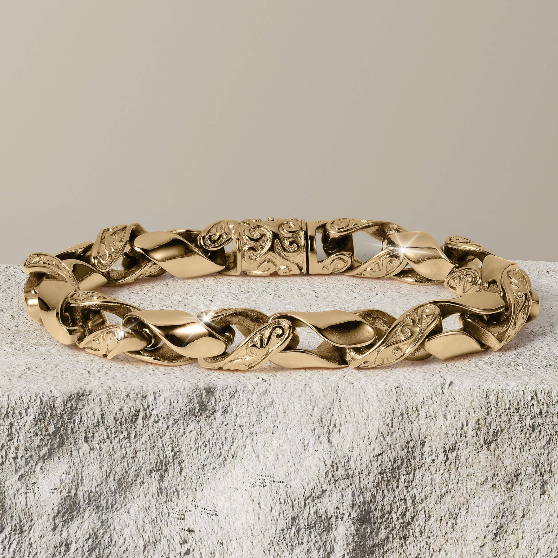 A bold statement collection, designed to elevate your style. Premium grade stainless steel finished in yellow gold. The unique links have a standout feature, an intricate scroll detail delicately twisted throughout the links, adding a touch of artistry and intrigue to your ensemble. Whether worn individually for a subtle touch of refinement or paired together for maximum impact, this collection is a symbol of strength, style and individuality.