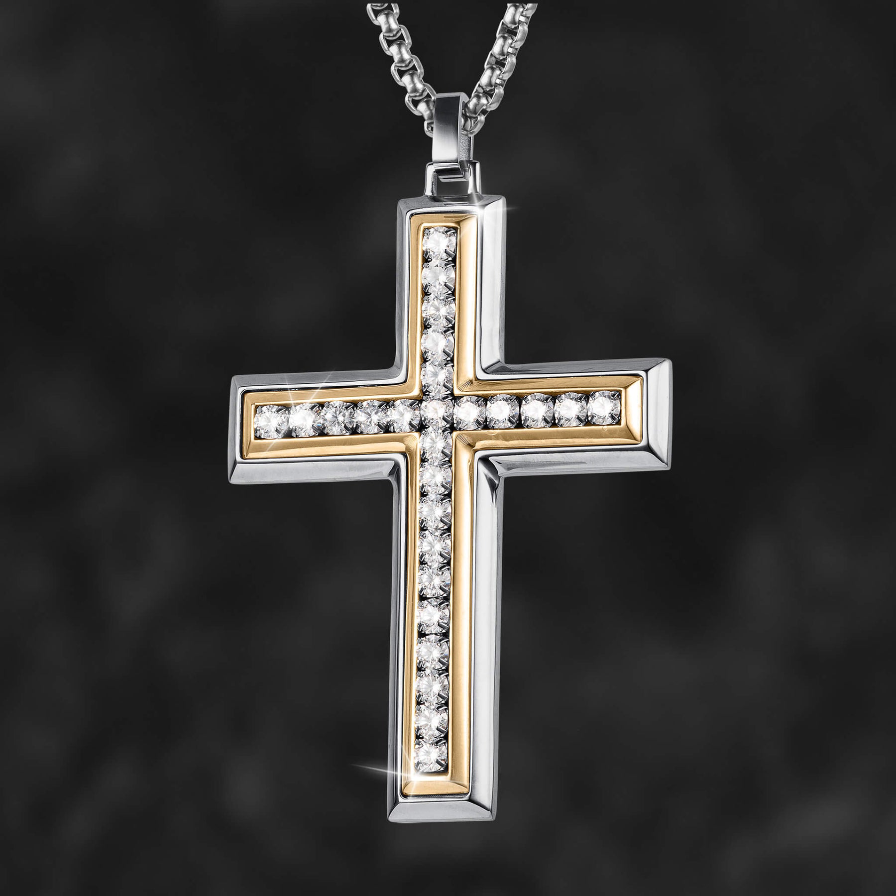 A distinguished 3 piece collection, a symbol of strength and style. Crafted from stainless steel, finished in a two tone design. A standout cross, adorned with round shimmering Diamondeau®, flawless simulated diamond, symbolizes both faith and fashion. Paired seamlessly is the matching bracelet, creating a cohesive look that exudes confidence. Completing the ensemble is a band ring that echoes the design elements of the cross and bracelet, creating a harmonious trifecta of style.