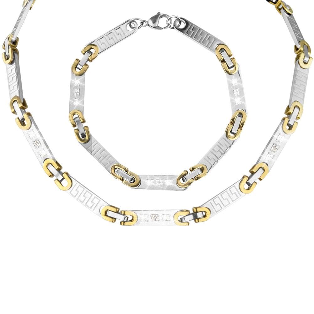 Links of premium grade 316L solid stainless steel are etched with a classical and ancient meander pattern that are held in place by curved links plated in 18k yellow gold. 3 of the links have been expertly set with panels of our flawless lab Diamondeau® - flawless simulated diamond. This modern and sporty collection is the perfect gift for any design conscious man that appreciates luxury.