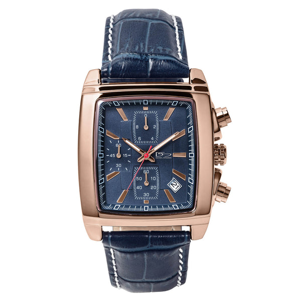 The perfect balance of classic styling and rugged looks. Our men’s chronograph watch features a rectangular case with a rose gold finish. Easy to read date window situated between 4 & 5 o’clock. The croc effect leather strap with stitch detailing in navy blue or chocolate brown will no doubt make a lasting impression. You can wear this timepiece comfortably with any type of attire for any kind of occasion.