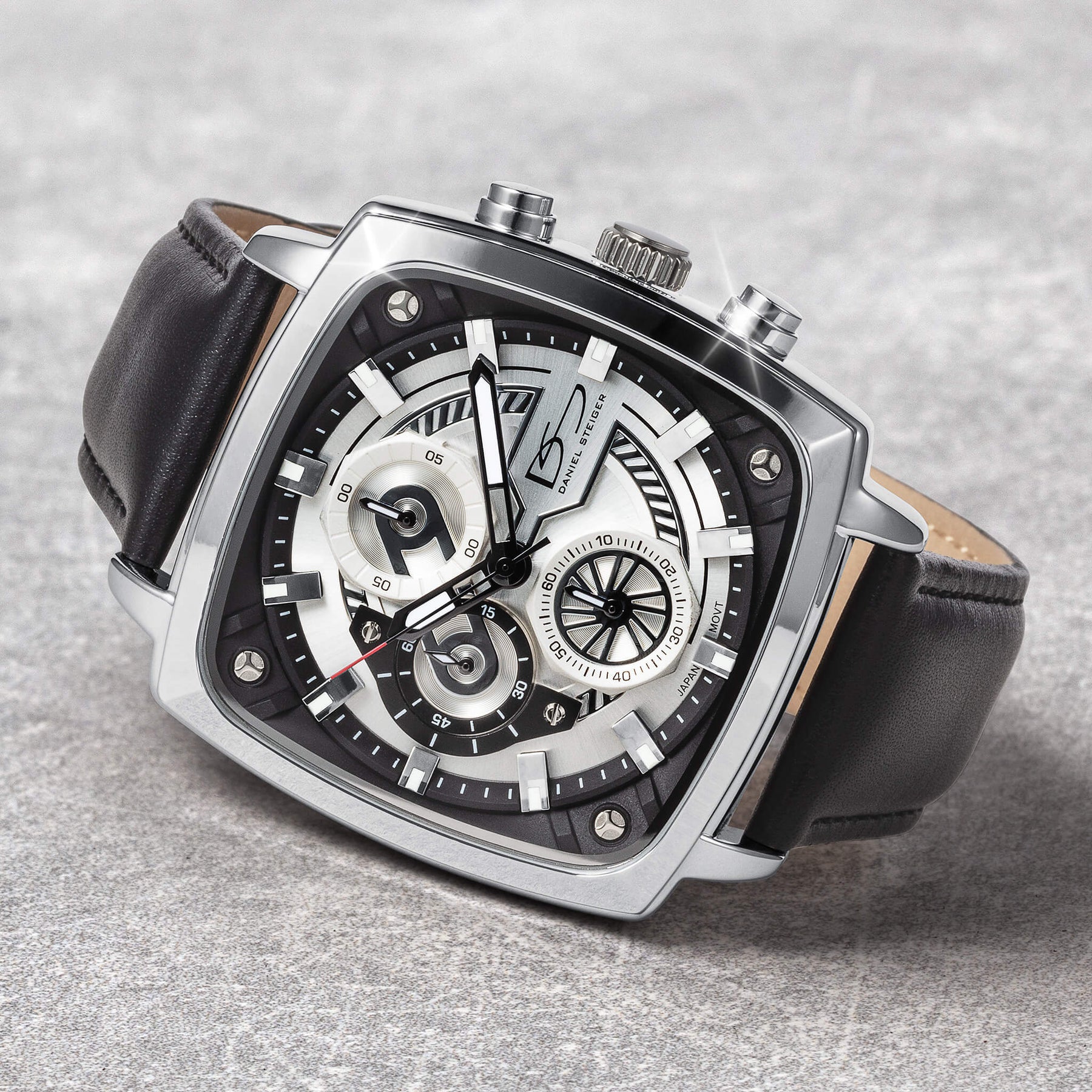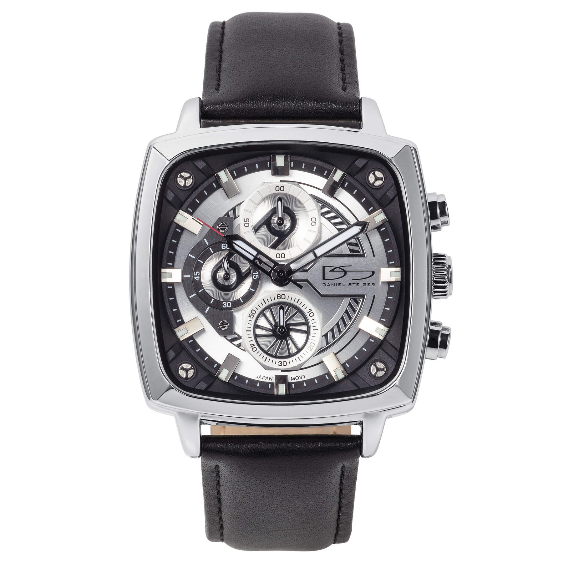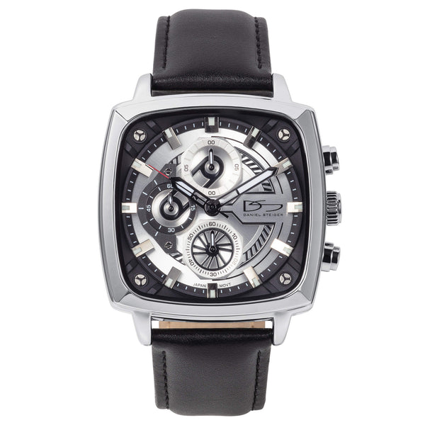 A sleek black leather strap with subtle stitch detailing adds a refined touch, seamlessly complementing the watch’s bold square case. The standout feature of this timepiece is the striking chronograph dial in black & silver. Each dial is intricately designed to capture attention, making it as much a statement of style as it is a tool for precision. Whether you’re in a business meeting or enjoying a casual day out this watch ensures you’re always on time and always turning heads.