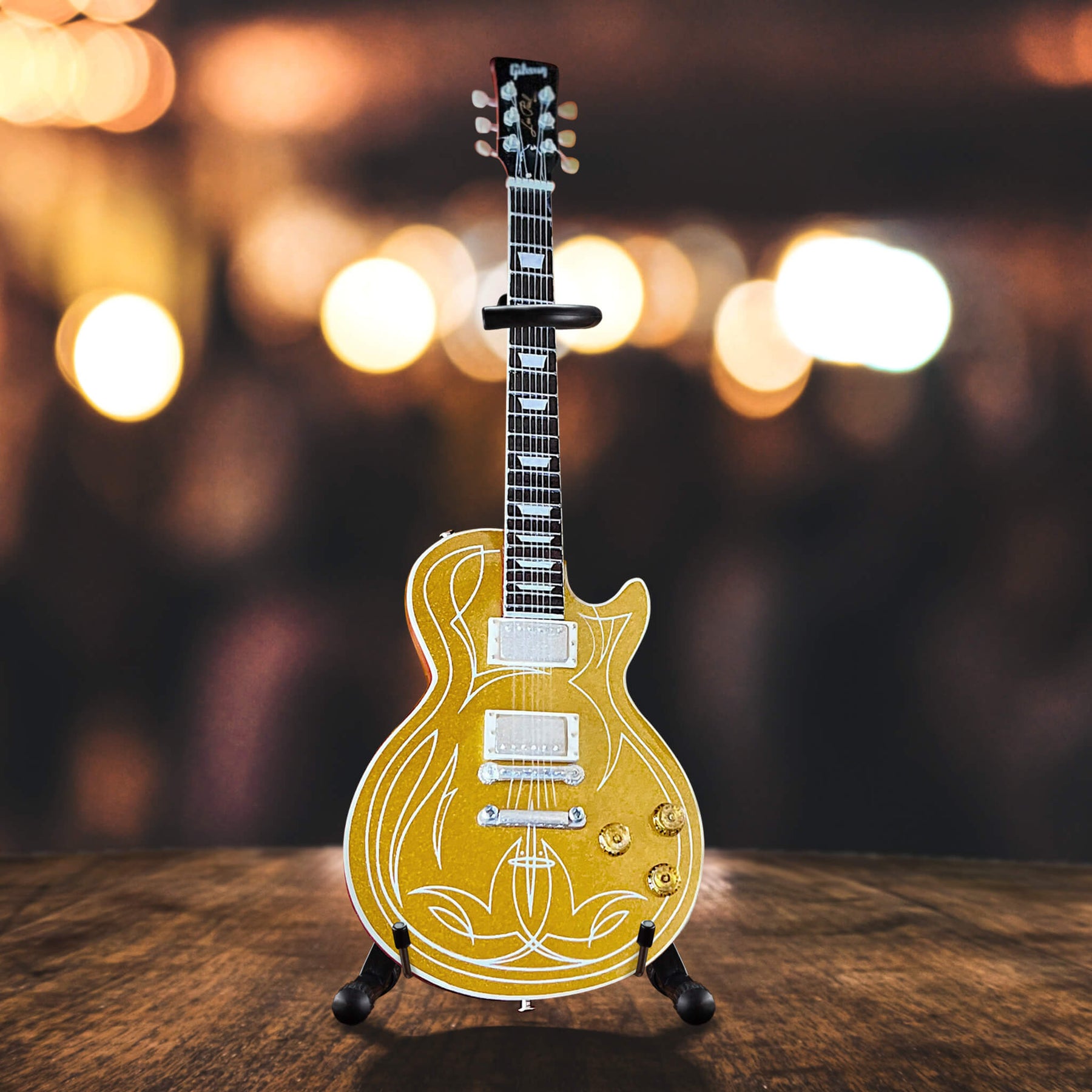 We bring you the signature guitar of the ZZ Top legend. The Billy F Gibbons Gibson Les Paul Pinstripe Goldtop, a guitar that became synonymous with Gibbons iconic sound and style. The 1:4 scale model embodies the distinctive Pinstripe Goldtop finish that graced stages and recordings alike. Great models that pay tribute to influential musicians.