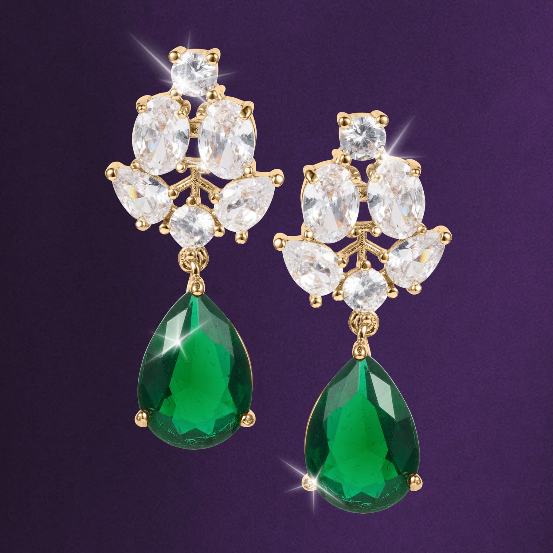 A vision of luxury, these exquisite earrings are designed to captivate at first glance. Deep emerald-green stones are gracefully framed by radiant Diamondeau®, flawless simulated diamond accents, creating a striking contrast that shimmers with every movement. These earrings echo regal elegance for a perfectly balanced look. Crafted to make a statement, they embody sophistication and grandeur ideal for evening galas, weddings, or any occasion where elegance takes center stage. The harmonious blend of rich green tones and brilliant sparkle delivers an aura of confidence, refinement, and unforgettable charm.