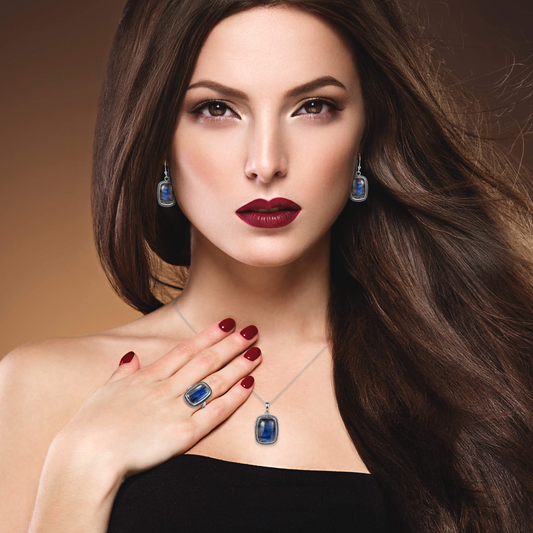 This elegant ladies’ jewelry set showcases luminous Labradorite stones, each glowing with captivating flashes of deep blue and oceanic light. Hand-set in a refined silver, rhodium plated bezel with delicate beaded detailing, the earrings, pendant, and ring are designed to complement one another while standing beautifully on their own. Labradorite is celebrated for its natural iridescence -no two stones are ever alike- making each piece as unique as the woman who wears it. This labradorite set holds significance for those born in February and March.
