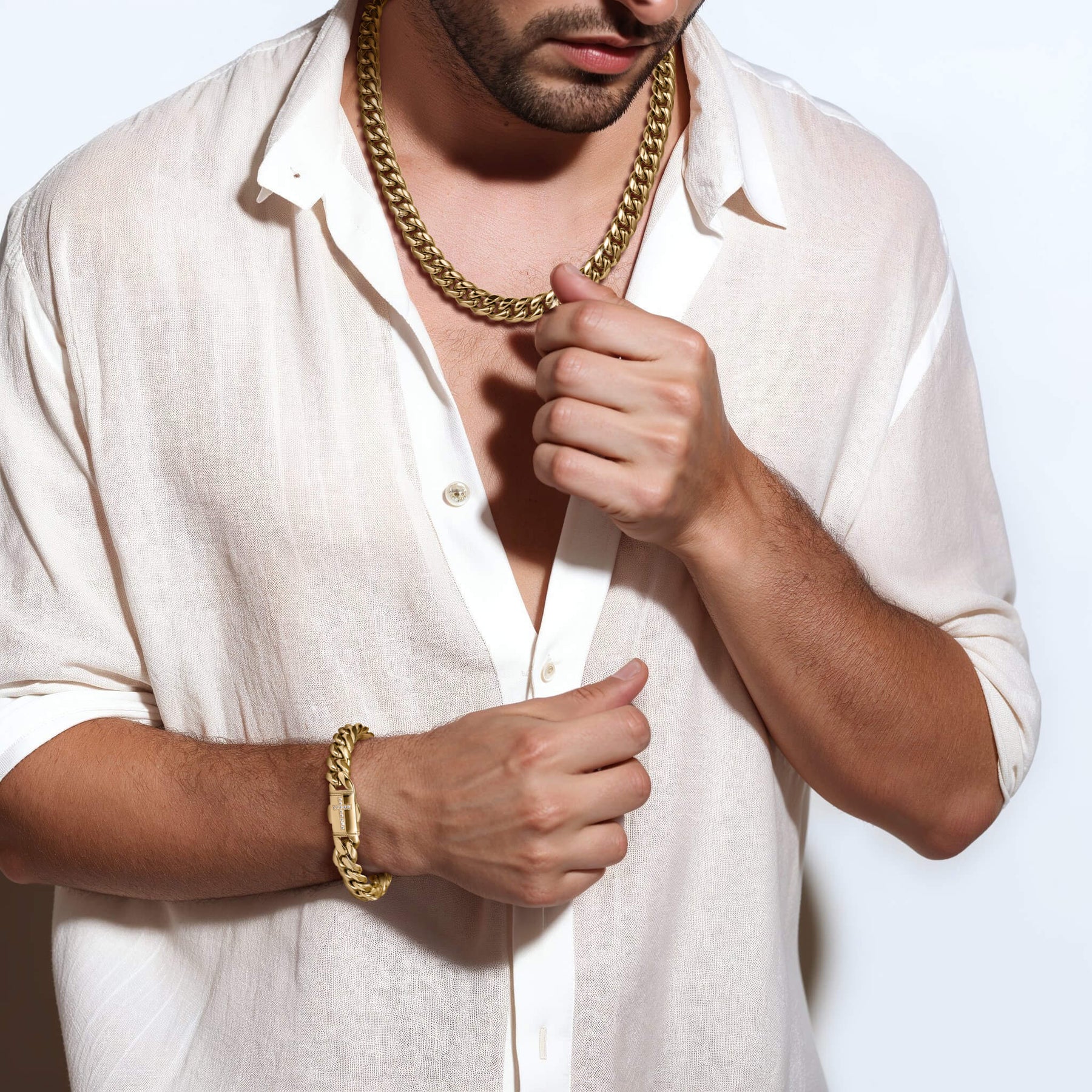 Designed for the man who values both faith and fashion, this bracelet exudes timeless style. Crafted from premium stainless steel and finished in yellow gold, the classic curb chain design delivers a polished, masculine look. The clasp features a cross, adorned with shimmering Diamondeau®, flawless simulated diamond stones, adding a touch of brilliance. A must-have for the man who is proud to wear his faith, this bracelet will elevate any ensemble with meaning and style. Let each link remind you of the strength that comes from within.