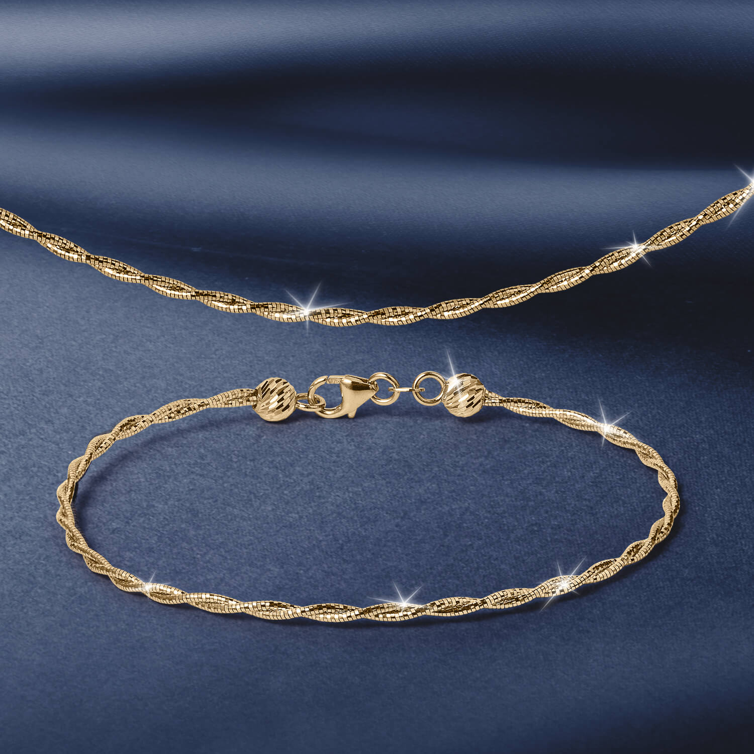 Twist and shine in this dazzling set from our Tesoro Vero twist collection. An exquisite double twist necklace is finely crafted by expert Artisans from 14k yellow gold, in the jewelry hub of Italy, Arezzo. Wear on its own or pair with the matching bracelet. The two pieces are expertly constructed for enduring style and a gleaming glint of luxury.