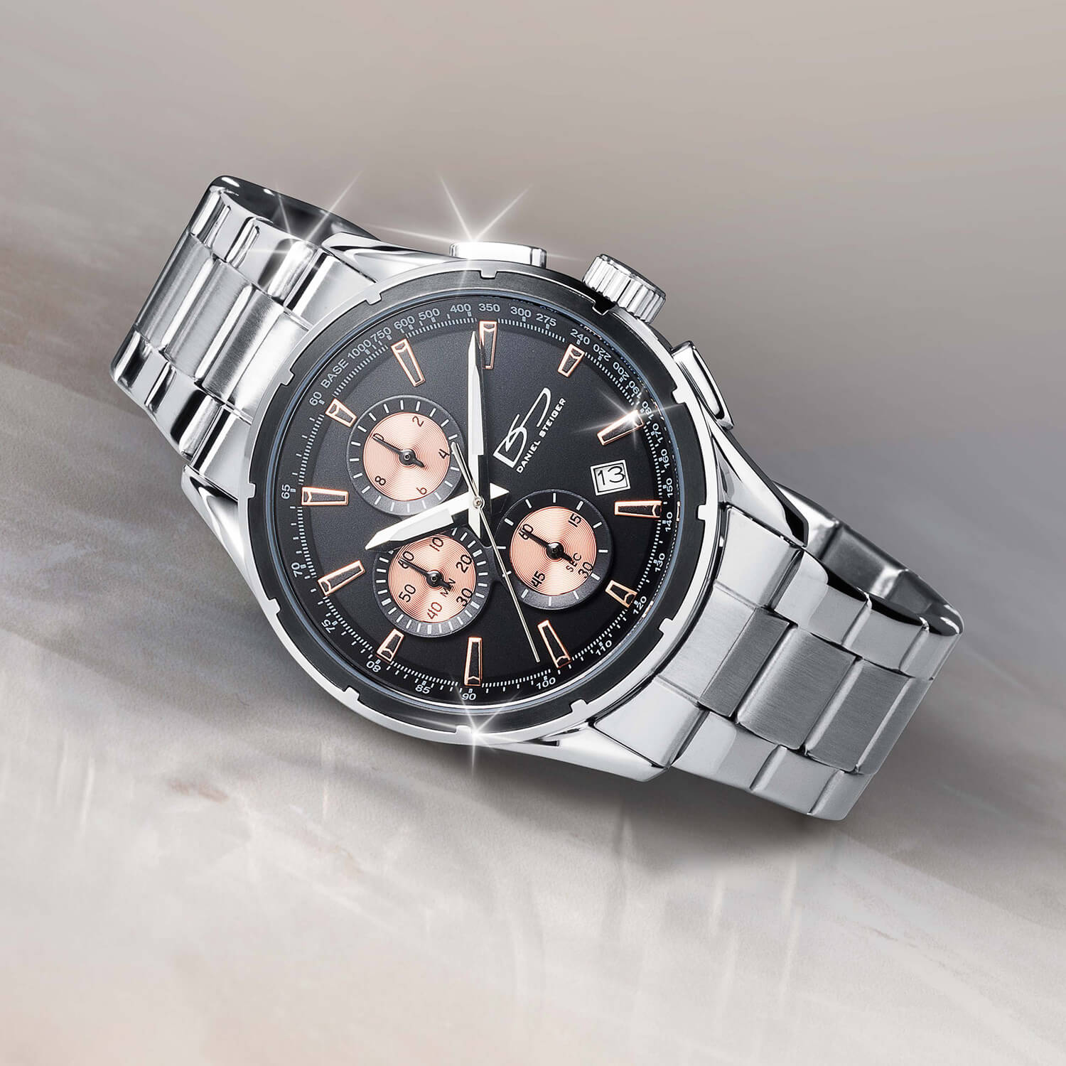 Not too much and not too little, our Elevation watch is just the right blend of comfort and style all rolled into one. A black dial has a useful date window and 3 chronograph sub dials, 1/10th seconds, seconds and minutes in a rose gold finish, with rose gold indices.