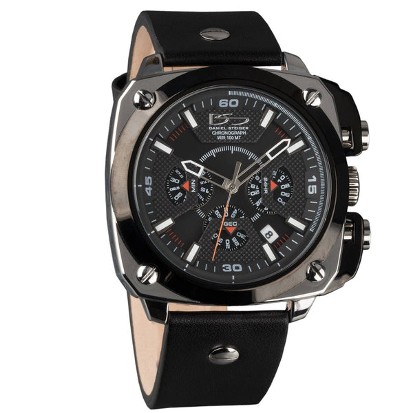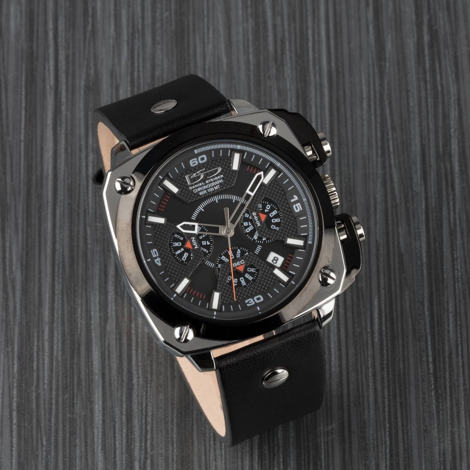 These watches are packed with features. The precision chronograph movement also features a date window. A designer case with strategically placed, small bolts; practical but a feature also. All held secure with a natural leather band.