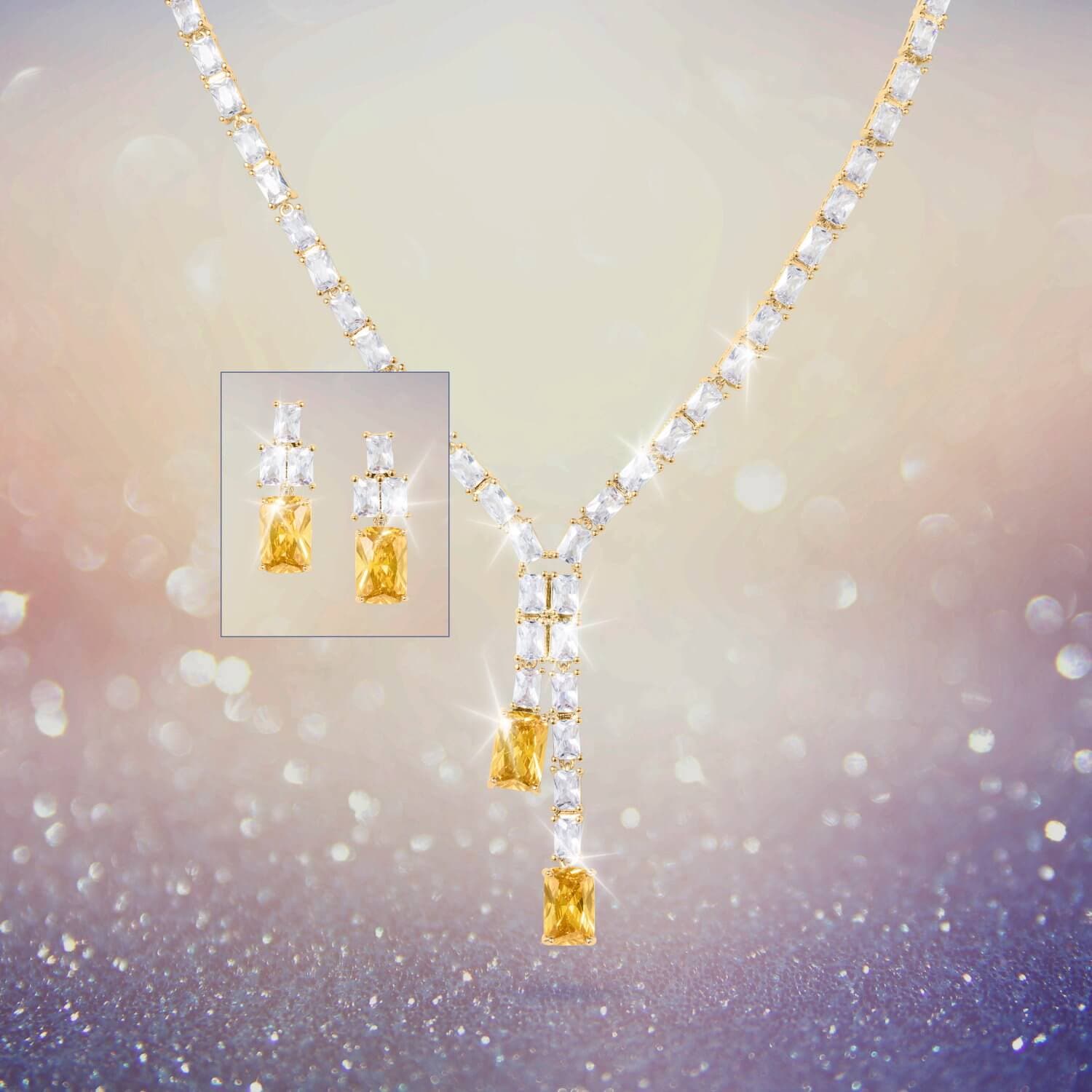Inspired by the twinkling stars in the night sky, this collection was created with our designers. Emerald cut honey and brilliant white Diamondeau®, flawless simulated diamond flow delicately down to a designer split drop. The whole collection is given an added touch of luxury and expertly plated in 18ct yellow gold. Exquisite pieces of jewelery like this are destined to be seen on the stars at red carpets and catwalks. We bring you the same great looks at an affordable price tag, with the same quality craftsmanship.